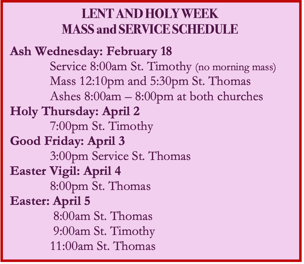 In the event of delays or closings, Weekday Morning Mass at St. Timothy will be celebrated at St. Thomas. Check WFSB for updates.